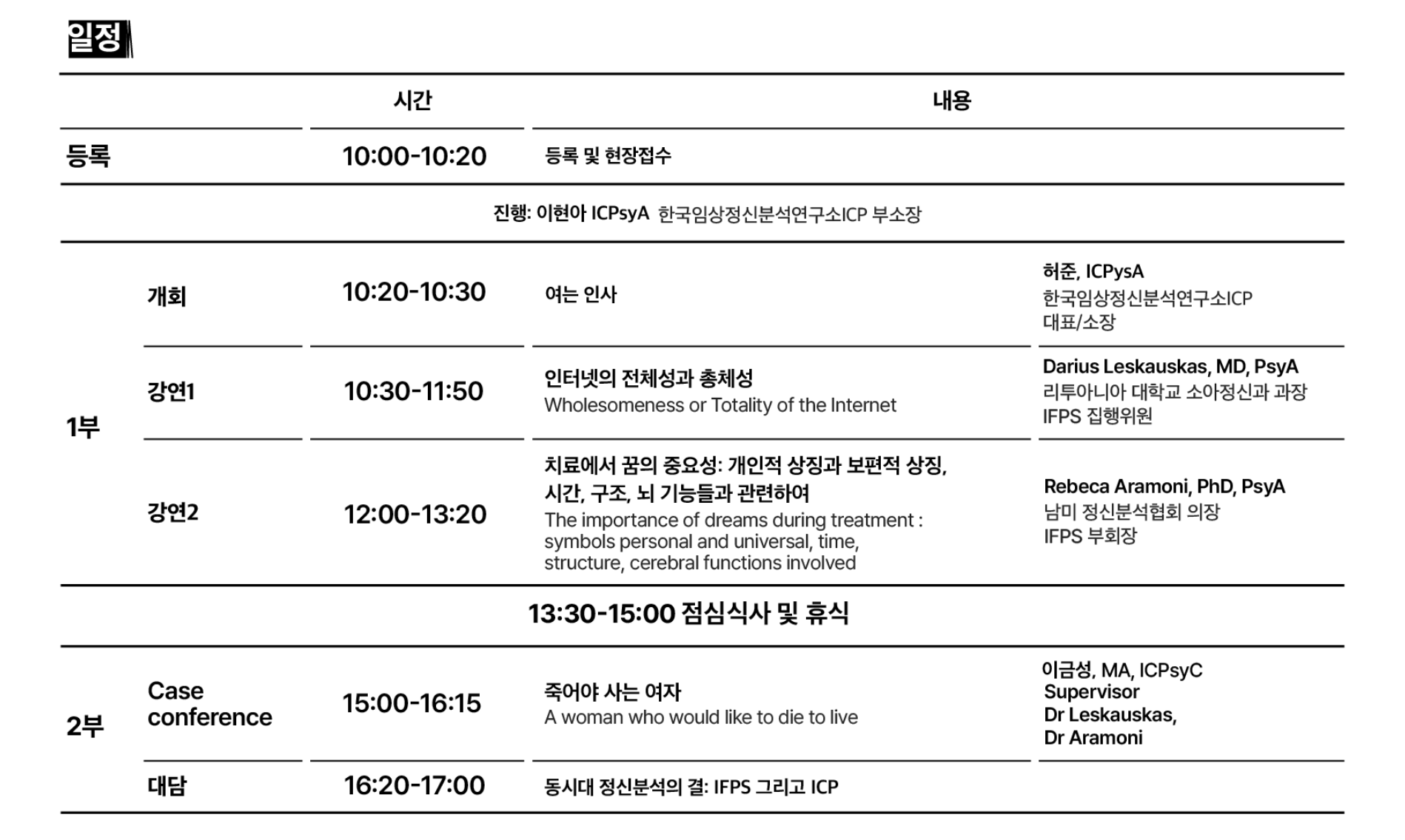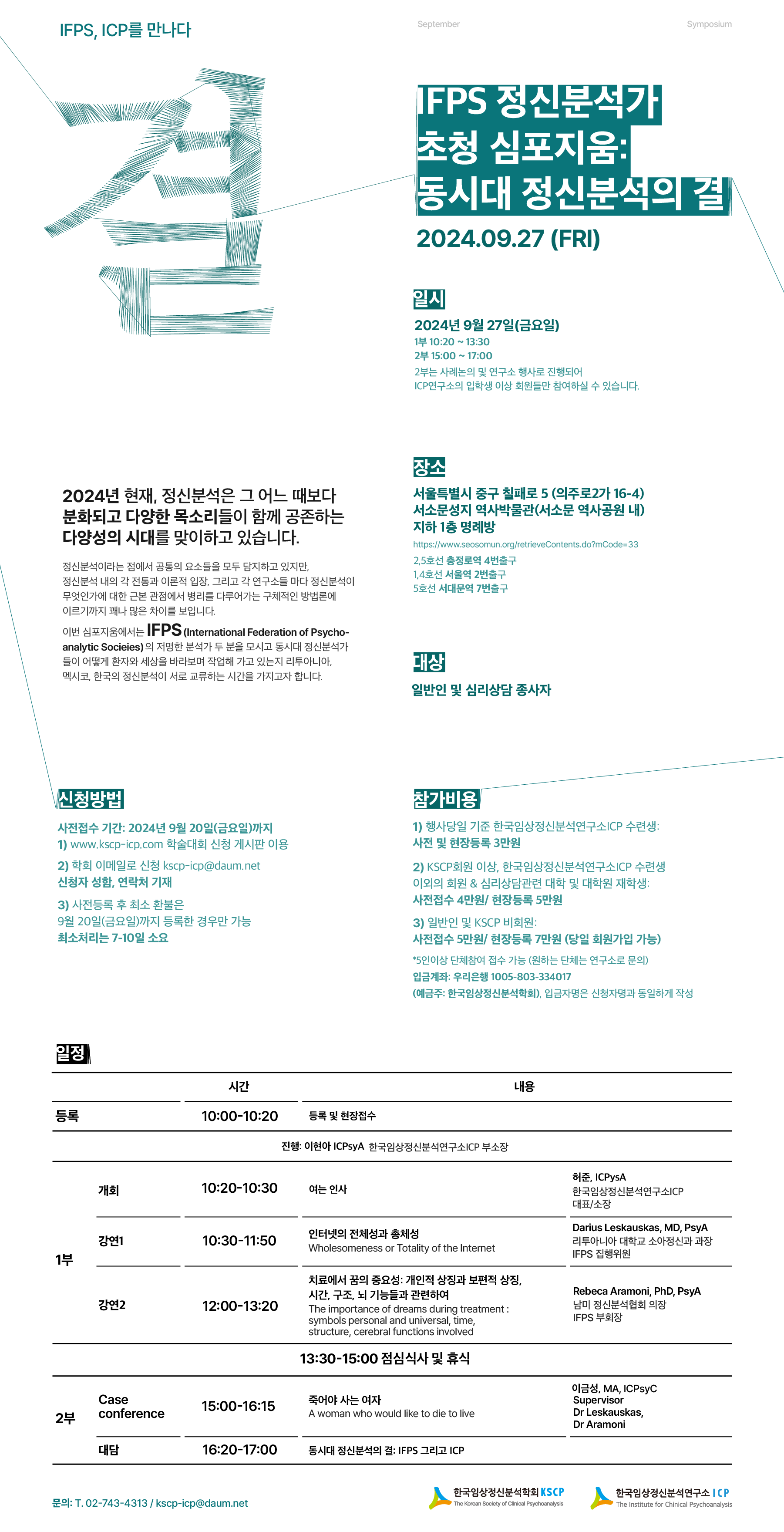 À̹ø ½ÉÆ÷Áö¾ö¿¡¼´Â IFPS(International Federation of Psychoanalytic Societies)ÀÇ Àú¸íÇÑ ºÐ¼®°¡ µÎ ºÐÀ» ¸ð½Ã°í µ¿½Ã´ë Á¤½ÅºÐ¼®°¡µéÀÌ ¾î¶»°Ô ȯÀÚ¿Í ¼¼»óÀ» ¹Ù¶óº¸¸ç ÀÛ¾÷ÇØ °¡°í ÀÖ´ÂÁö ¸®Åõ¾Æ´Ï¾Æ, ¸ß½ÃÄÚ, Çѱ¹ÀÇ Á¤½ÅºÐ¼®°¡°¡ ¼·Î ±³·ùÇÏ´Â ½Ã°£À» °¡Áö°íÀÚ ÇÕ´Ï´Ù |