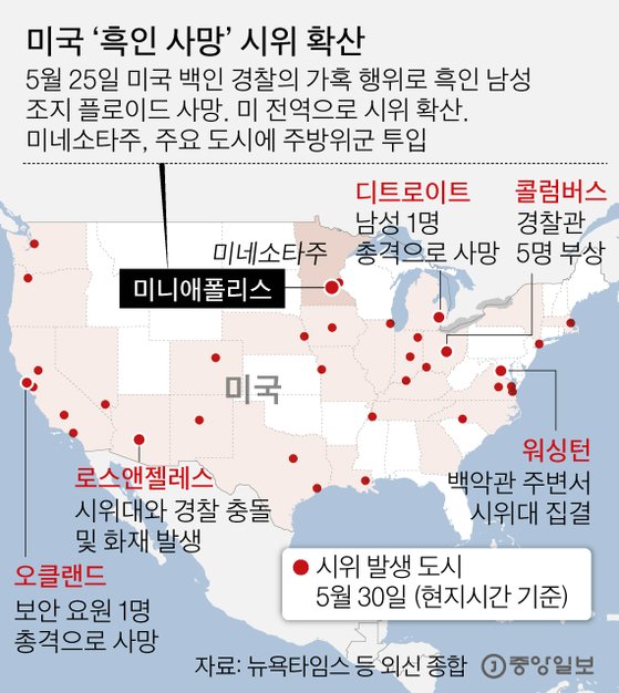 ¹Ì±¹¡®ÈæÀÎ »ç¸Á¡¯½ÃÀ§ È®»ê ±×·¡ÇÈ=±èÁÖ¿ø ±âÀÚ zoom@joongang.co.kr Ä¡¾ÈÀÌ ±Þ¼ÓÇÏ°Ô ¾ÇÈÇÏÀÚ LA¡¤½ÃÄ«°í¡¤Çʶóµ¨ÇǾơ¤¾ÖƲ·£Å¸¡¤µ§¹ö¡¤¹Ð¿öŰ¡¤½Å½Ã³»Æ¼ µî ÃÖ¼Ò 25°÷ÀÌ ¾ß°£ ÅëÇà±ÝÁö·ÉÀ» ³»·È´Ù. ¹Ì ¿¬¹æ¼ö»ç±¹(FBI)Àº ͏®Æ÷´Ï¾Æ ¿ÀŬ·£µå¿¡¼ ½ÃÀ§¸¦ ÁöÄѺ¸´ø ±¹Åä¾Èº¸ºÎÀÇ °è¾àÁ÷ º¸¾È¿ä¿ø 1¸íÀÌ ÃÑ¿¡ ¸Â¾Æ ¼ûÁ³´Ù¸ç À̸¦ ¡®±¹³» Å×·¯ÇàÀ§¡¯·Î ±ÔÁ¤Çß´Ù. ¶Ç ´Ù¸¥ ±¹Åä¾Èº¸ºÎ Á÷¿øµµ ºÎ»óÀ» ÀÔ°í À§ÁßÇÑ »óÅ´Ù. ¿ÀÇÏÀÌ¿ÀÁÖ ÄÝ·³¹ö½º¿¡¼µµ ½É¾ß¿¡ ½ÃÀ§´ë°¡ ´øÁø µ¹¿¡ ¸Â¾Æ °æÂû°ü 5¸íÀÌ ºÎ»óÇÏ°í »óÁ¡ 10¿© °÷ÀÌ ¾àÅ»´çÇß´Ù. µðÆ®·ÎÀÌÆ®¿¡¼´Â 21¼¼ ³²¼ºÀÌ ÃÑ¿¡ ¸Â¾Æ ¼ûÁ³´Ù.